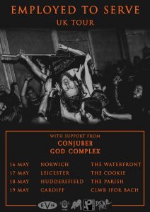 Employed To Serve have announced a small tour from the 16th-19th May with support from Conjurer and God Complex. Conjurer have recently completed a four-date headline tour (selling out the London show), and been booked for UK Tech-Fest and 2000 Trees Festival. God Complex, only forming last year, have released their second brutal video, Insignificant. They have also toured with Venom Prison and Corrupt Moral Altar, and played alongside Loathe.